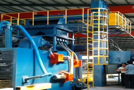 吊鉤通過式拋丸機主要用于混凝土攪拌車結構件表面的拋噴丸清理。利用拋丸器高速旋轉的葉輪將鋼絲切丸(彈丸)加速拋打至工件表面,對工件表面進行沖擊、刮削,不但可以清理掉工件表面的氧化皮、焊渣、銹蝕和污物等,還可以消除工件的表面應力,提高工件的抗疲勞強度