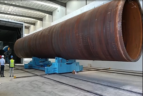 風電塔筒拋丸機設備用途:該拋丸機設備主要是針對目前國內外風力發電設備中的風電塔筒內外表面拋丸處理專門設計的。用于自動拋丸清理風電塔筒內外表面的銹蝕、焊渣、氧化皮、油污等一切污物,使其露出均勻一致的金屬本色,保證表面的清潔度,提結構件與涂料的結合力