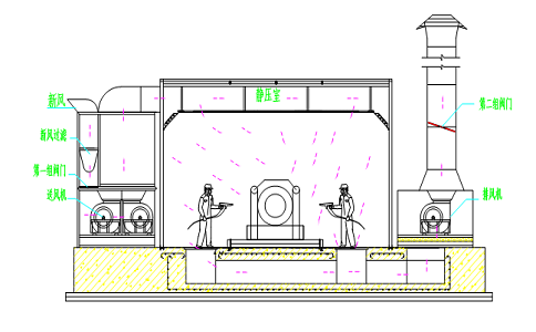 機車噴烘一體房采用上部送風,下部排風的干式漆霧處理結構。 設計時嚴格按照國家有關安全,衛(wèi)生,消防及環(huán)保等方面的標準要求執(zhí)行,整個設計以用戶的要求為依據(jù),結合工件及使用涂料現(xiàn)狀,按照涂裝工藝規(guī)范要求進行設計。