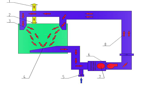 在機車噴烘一體房地面設置左、右二道排風溝,在風溝中安裝有漆霧過濾裝置(原理見漆霧處理方式圖),用以吸附過噴漆霧中的樹脂等固體分。漆霧過濾裝置由過濾纖維托網(wǎng)及過濾纖維棉構成,折流過濾纖維棉放置在托網(wǎng)上。
