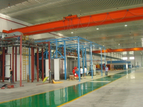 靜電粉體涂裝生產(chǎn)線工藝流程(一) 上件 → 熱水洗 →預(yù)脫脂(60℃) →主脫脂(60℃) →水洗(1) →水洗(2) →酸洗 →水洗(3) →水洗(4) →表調(diào) →磷化(40--45℃,鋁材使用鉻化工藝)→水洗(5) →水洗(6) →純水洗(1) →脫水烘干(120℃) →靜電噴粉系統(tǒng)(含噴粉房、自動噴涂升降往復(fù)機(jī)、靜電發(fā)生器、靜電噴槍、粉桶、小旋風(fēng)粉末回收裝置) →烘干固化(160℃-420℃) →冷卻 →下件