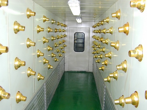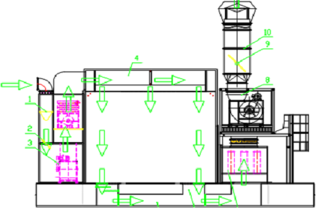 高壓電柜噴粉烘干固化自動生產線隔離室 1.設計原理 為了減少噴粉車間不受到外界的污染、工件在生產線上的再次污染、提高成品率,在噴粉車間外設計一隔離室,防止車間內灰塵的再次污染,補風采用頂部經初效過濾自然進風。