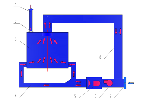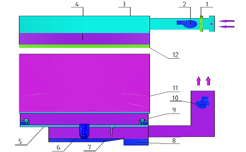 叉車涂裝生產(chǎn)線水旋噴漆室原理圖 新鮮空氣通過空調(diào)送風裝置送入室體頂部的空氣分配室,經(jīng)均流調(diào)節(jié)和過濾層后,以一定的端面風速均勻送入室體內(nèi),自上而下,將工件置入具有一定風速的均流層中,使飛濺的廢漆霧壓入水旋器處理,這樣既改善了工作環(huán)境,又保證了涂層質(zhì)量。