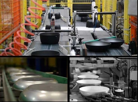 鐵氟龍噴涂生產(chǎn)線(xiàn)?主要針對(duì)廚具行業(yè)如不粘鍋,電飯鍋內(nèi)膽,刀具,烤盤(pán)等等。其主要工藝流程:噴砂前處理 → 吹塵 → 噴底油 → 固化 → 噴面漆 → 燒結(jié) → 冷卻 → 下件。