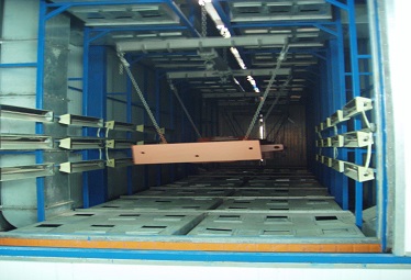 室體主材料 電加熱烤漆烘干房烘道骨架的立柱、橫梁采用□120×120×5方管制作,檁條采用□50×50×4矩形鋼管,均做防腐處理,具有保溫性能好、支撐剛度高的特點;內壁板材料采用厚度為δ1.5mm的鍍鋅鋼板,外壁板采用厚度為δ0. 476mm的波紋彩鋼板,中間填充δ200mm厚的巖棉夾芯(巖棉密度為120公斤/立方米)保溫板,室體包邊包角材料為δ1.5mm冷板,保溫性能強,使外壁板溫度不高于室溫5℃。 | 鋼結構平臺 采用14#槽鋼拼焊而成,臺面鋪設δ4mm花紋板,設計在烘干室上方,直接通過立柱與地面相連,即烘干室本身不承載鋼結構平臺,兩者是隔開的。在鋼結構平臺上安裝熱風循環加熱系統。為便于操作人員檢修,在平臺一側設置有鋼爬梯,四周設置有安全防護欄桿,爬梯、欄桿均按國家標準設計制作。 | 電動平移門 在室體兩端設置兩套電動平移門,復合保溫板材料,大門采用推拉式,大門四周安裝有密風膠條,防止門縫及大門與鋼軌處漏風,大門上安有觀察窗可以方便觀察室內工作情況同時便于自然采光。整個大門結構合理、開關速度均勻、安全可靠,密封性能好、維修率低、操作方便;電動平移門的啟閉采用鏈條傳動的開門機構,大門與電瓶驅動臺車之間設有電控啟閉信號,當電瓶驅動臺車接近大門時,檢測元件發出控制信號,大門打開;當工件達到達工位后,室內檢測元件發出控制信號,大門關閉,同時啟動通風系統,開始作業;大門裝有聲光報警器,大門開啟或關閉時發出聲光報警 |