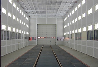 室體主材料 烘道骨架的立柱、橫梁采用□120×120×5方管制作,檁條采用□50×50×4矩形鋼管,均做防腐處理,具有保溫性能好、支撐剛度高的特點;內壁板材料采用厚度為δ1.5mm的鍍鋅鋼板,外壁板采用厚度為δ0.80mm的波紋彩鋼板,中間填充δ200mm厚的巖棉夾芯(巖棉密度為120公斤/立方米)保溫板,室體包邊包角材料為δ1.5mm冷板,保溫性能強,使外壁板溫度不高于室溫5℃。 | 鋼結構平臺 采用14#槽鋼拼焊而成,臺面鋪設δ4mm花紋板,設計在烘干室上方,直接通過立柱與地面相連,即天然氣加熱烤漆烘干房本身不承載鋼結構平臺,兩者是隔開的。在鋼結構平臺上安裝熱風循環加熱系統。為便于操作人員檢修,在平臺一側設置有鋼爬梯,四周設置有安全防護欄桿,爬梯、欄桿均按國家標準設計制作。 | 電動提升門 選用國際新型卷簾門,保溫作用好、抗彎性強,防止冷凝水出現;型材表面為多層烤漆或薄膜層,具有優良的抗劃傷性能,抗腐蝕、不腐化、耐磨、抗敲打、抗撞擊;在啟動運行過程中,快捷且無噪音(速度可達約0.1m/s,噪音小于58分貝) |