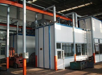 在工作時,通過新風機組內的換熱裝置對循環風進行加熱。烘干設計溫度0~80±5℃,加熱能源天燃氣,熱風從頂部送入,下部回風。以保證烘干室各段風量、溫度均勻。工件烘干過程中,工件漆膜內殘存的有機溶劑不斷揮發出來,為了使烘干室內的氣體中有機溶劑的含量低于爆炸濃度的下限,烘干室保持安全運行,循環熱風中要補充一定的新鮮空氣,同時要排出一定量的高濃度的廢氣。烘干室內裝有溫度傳感器,以顯示各點溫度,并設有自動調溫裝置,使溫度波動控制在±5℃以內。 | 天然氣加熱烤漆烘干房在工作時,新風空氣通過燃燒器加熱后,在循環風機作用下經過過濾器,進入烘干室底部的送風管道,熱風從出風口出排出進入烘干室內,對工件表面漆膜進行烘干,利用熱空氣上升原理,在頂部設置回風管路再進入循環風機組,使熱風能循環使用。 |