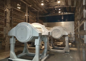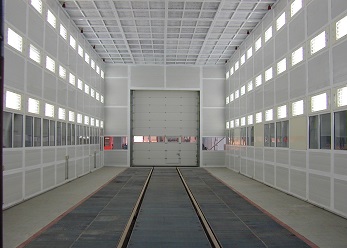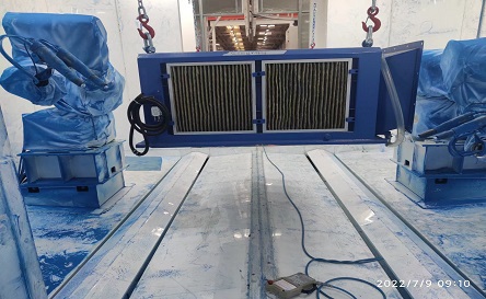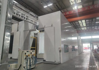 此噴涂線中工件輸送一般采用電動軌道車或天車為輸送方式。該噴涂線主要用于金屬工件、并且材質較厚、工件較大的設備、鋼板,如鑄鍛件、鋼結構件等。1噴1烘一般適合表面要求較低的設備(一般不建議采用),一般情況下,由于工件較大、重,生產量不高的情況下,噴砂(丸)、除塵都在噴砂房內處理。噴底漆、面漆、烘干都在噴烘一體房內進行。