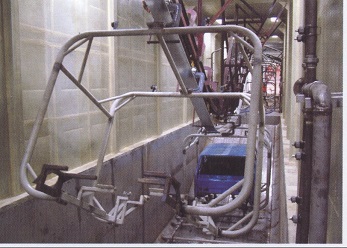噴漆涂裝線以塑料件工藝為代表,前處理大多采用噴射式處理方式(部分金屬件采用浸漬式或噴射與浸漬結(jié)合方式),其主要目的是通過化學(xué)液體(硫酸、硝酸)以浸泡或噴射的方式,與工件表面的氧化物、油脂等產(chǎn)生化學(xué)反映來達(dá)到除油、脫脂、水洗、純水洗的目的。表面涂料為防腐油漆、色漆、清漆等裝飾性油漆材料,并且考慮塑料件高溫變形,一般采用的油漆成膜溫度為50至80℃左右,自動(dòng)輸送系統(tǒng)前處理一般采用輕型懸掛鏈和輸送帶、網(wǎng)鏈送設(shè)備,前處理后轉(zhuǎn)線一般采用地鏈滑撬、懸掛輸送鏈等輸送方式。具體需要根據(jù)工件情況決定。其主要決定因素:工件大小、形狀、重量、材質(zhì)等。