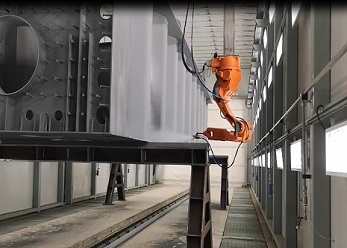 此方式采用機(jī)械(干式)表面前處理,以自動(dòng)機(jī)器人噴砂(丸)室、拋丸機(jī)設(shè)備為工件除銹、除油、改變工件表面粗糙度、增加其表面對(duì)涂料的附著力,然后進(jìn)行噴漆、烘干(此方式為3噴1烘工藝,可根據(jù)實(shí)際情況改為2噴1烘、2噴2烘,工序中4、5為可選工序)。