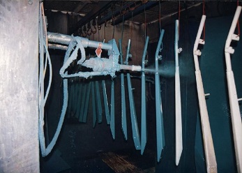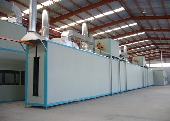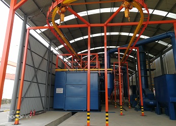 此噴涂線中工件輸送一般采用電動(dòng)軌道車或天車為輸送方式。該噴涂線主要用于金屬工件、并且材質(zhì)較厚、工件較大的設(shè)備、鋼板,如鑄鍛件、鋼結(jié)構(gòu)件等。1噴1烘一般適合表面要求較低的設(shè)備(一般不建議采用),一般情況下,由于工件較大、重,生產(chǎn)量不高的情況下,噴砂(丸)、除塵都在噴砂房內(nèi)處理。噴底漆、面漆、烘干都在噴烘一體房內(nèi)進(jìn)行。